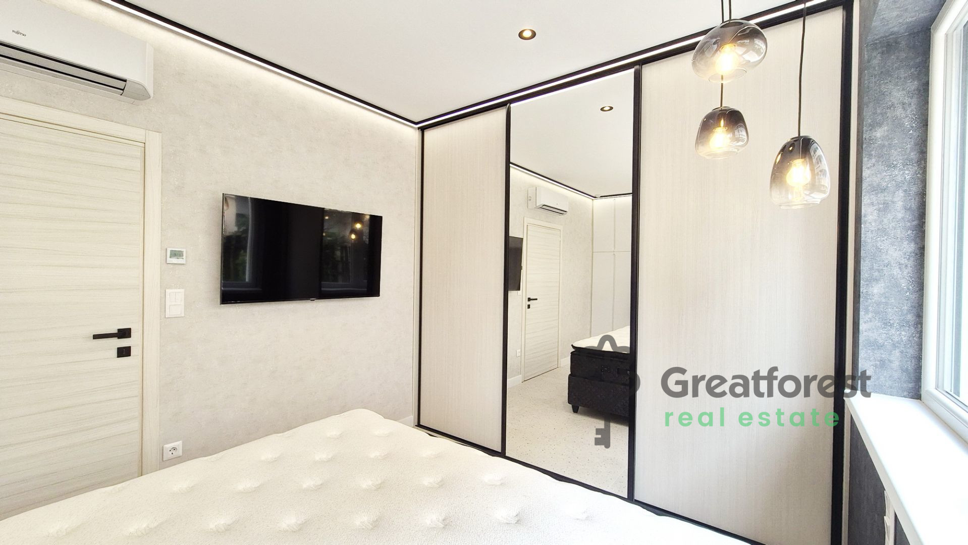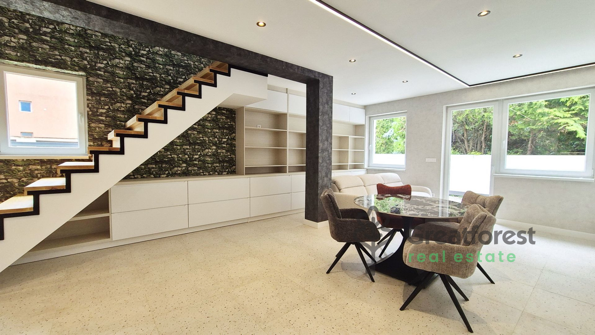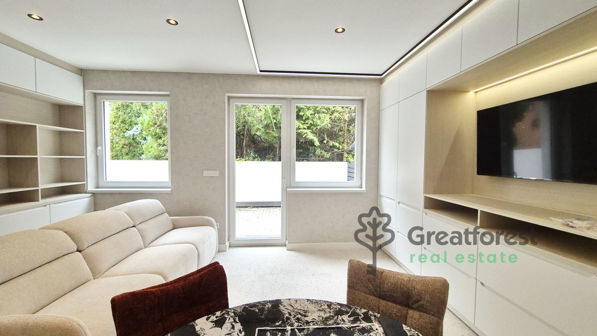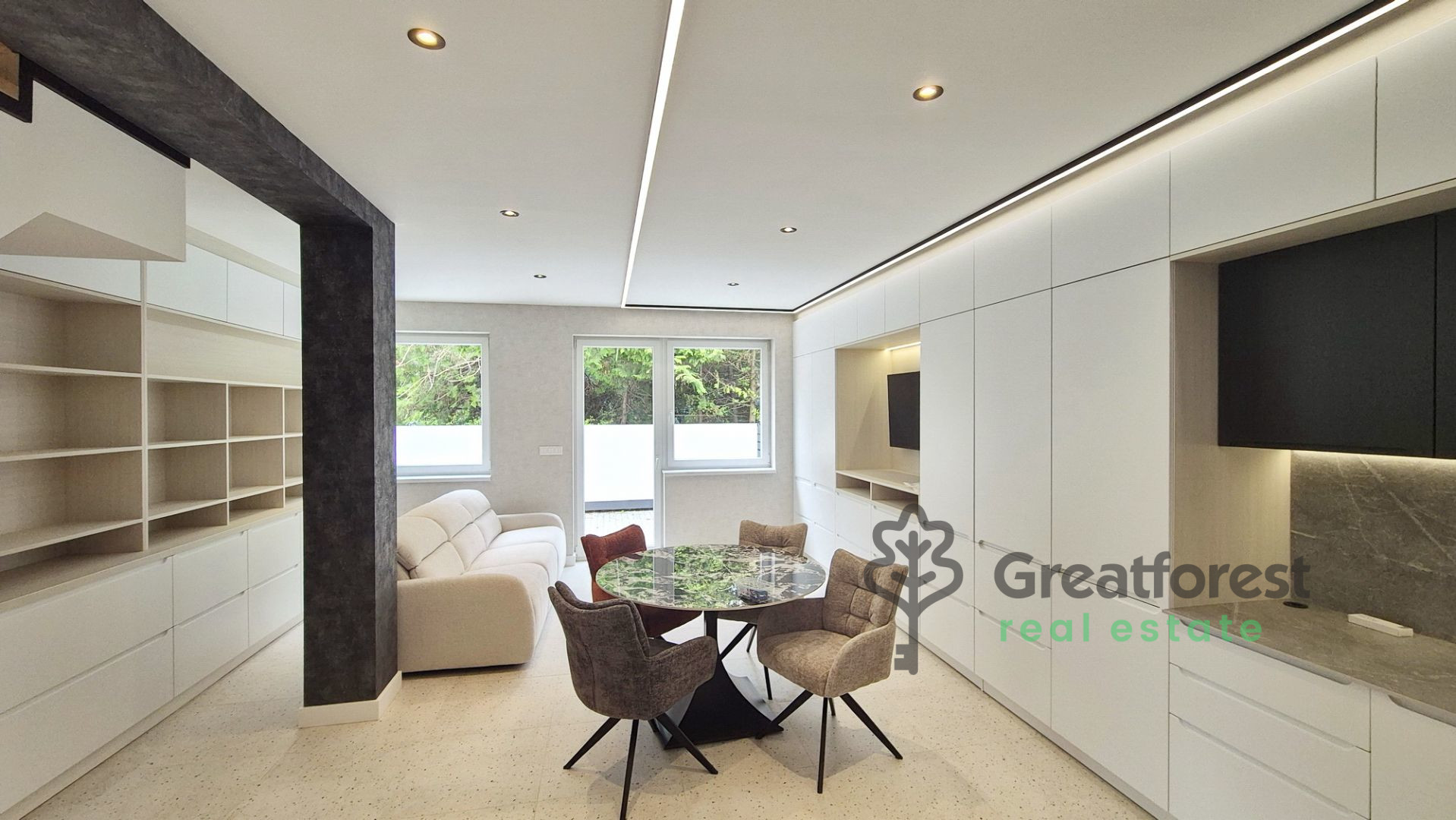 From the very first moment, you will be impressed by the bright and spacious living room, where the large windows flood the space with natural light. Carefully planned interior design solutions offer not only style but also practicality: built