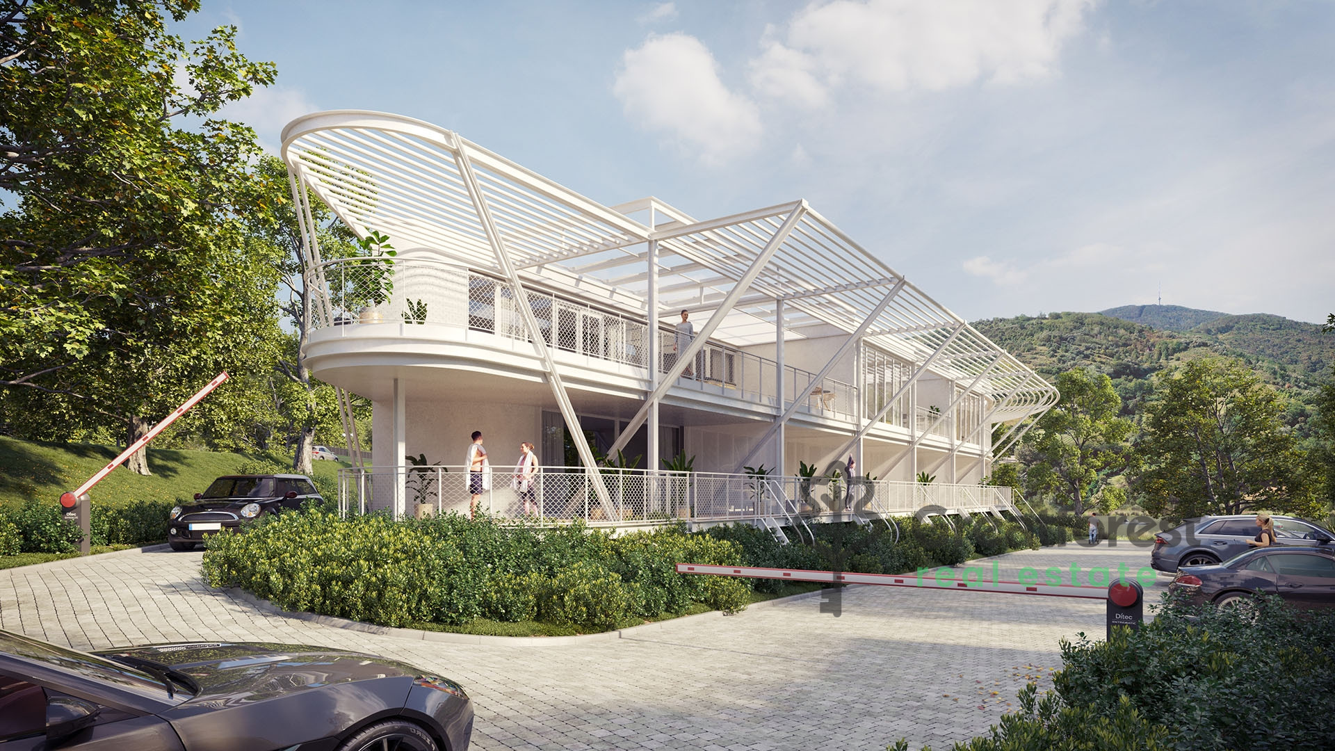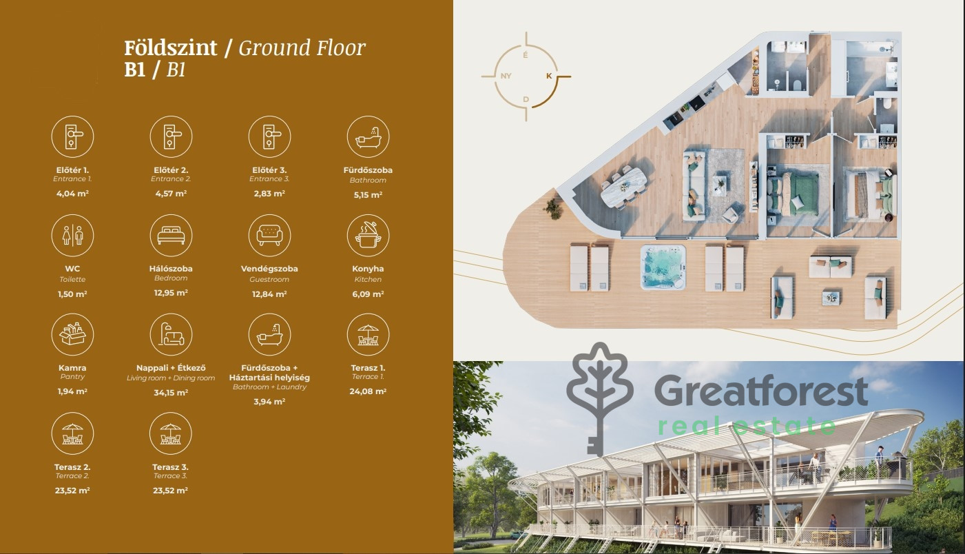 The floor area of the apartment numbered E1 on the 1st floor is 92.55 m², which includes a beautiful panoramic 26.20 m² terrace, which both statically and mechanically allows a jacuzzi to be installed.
