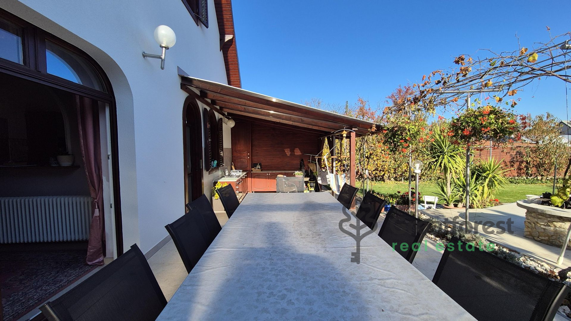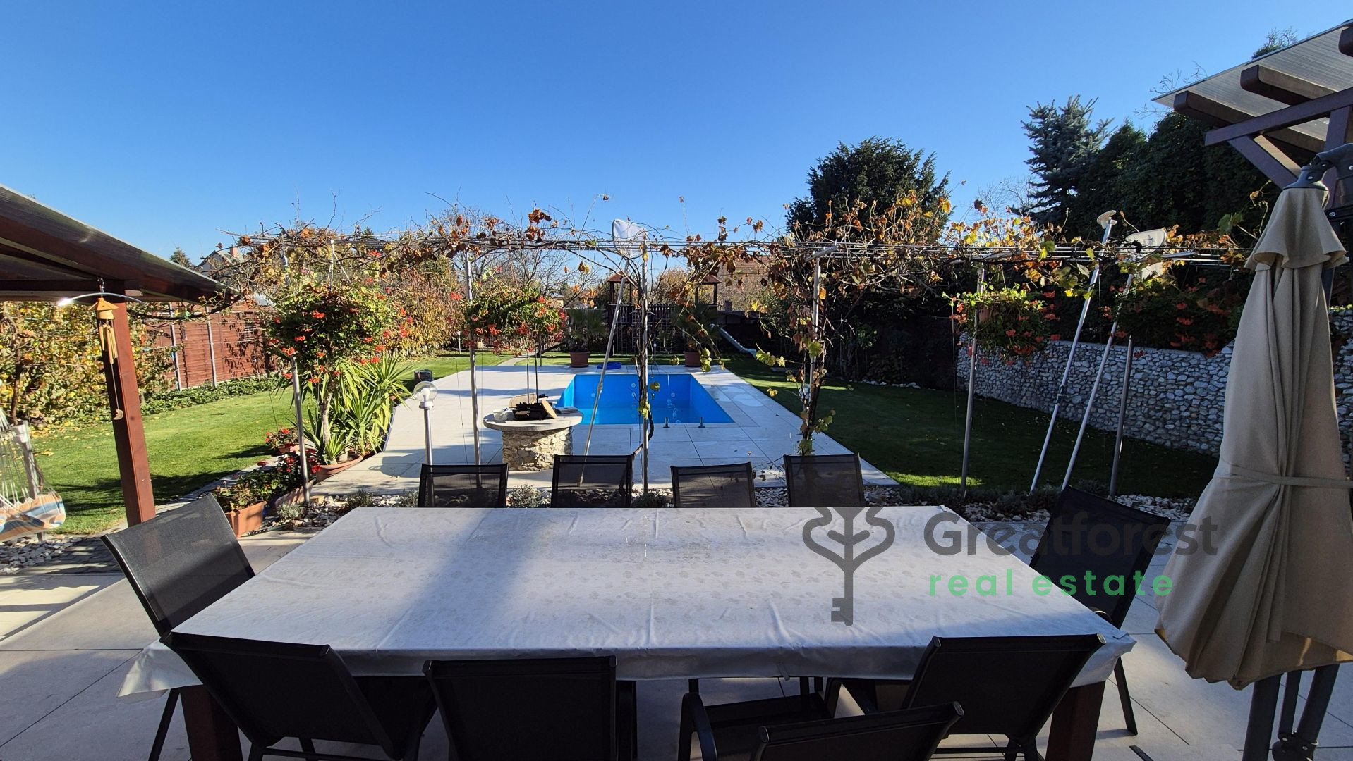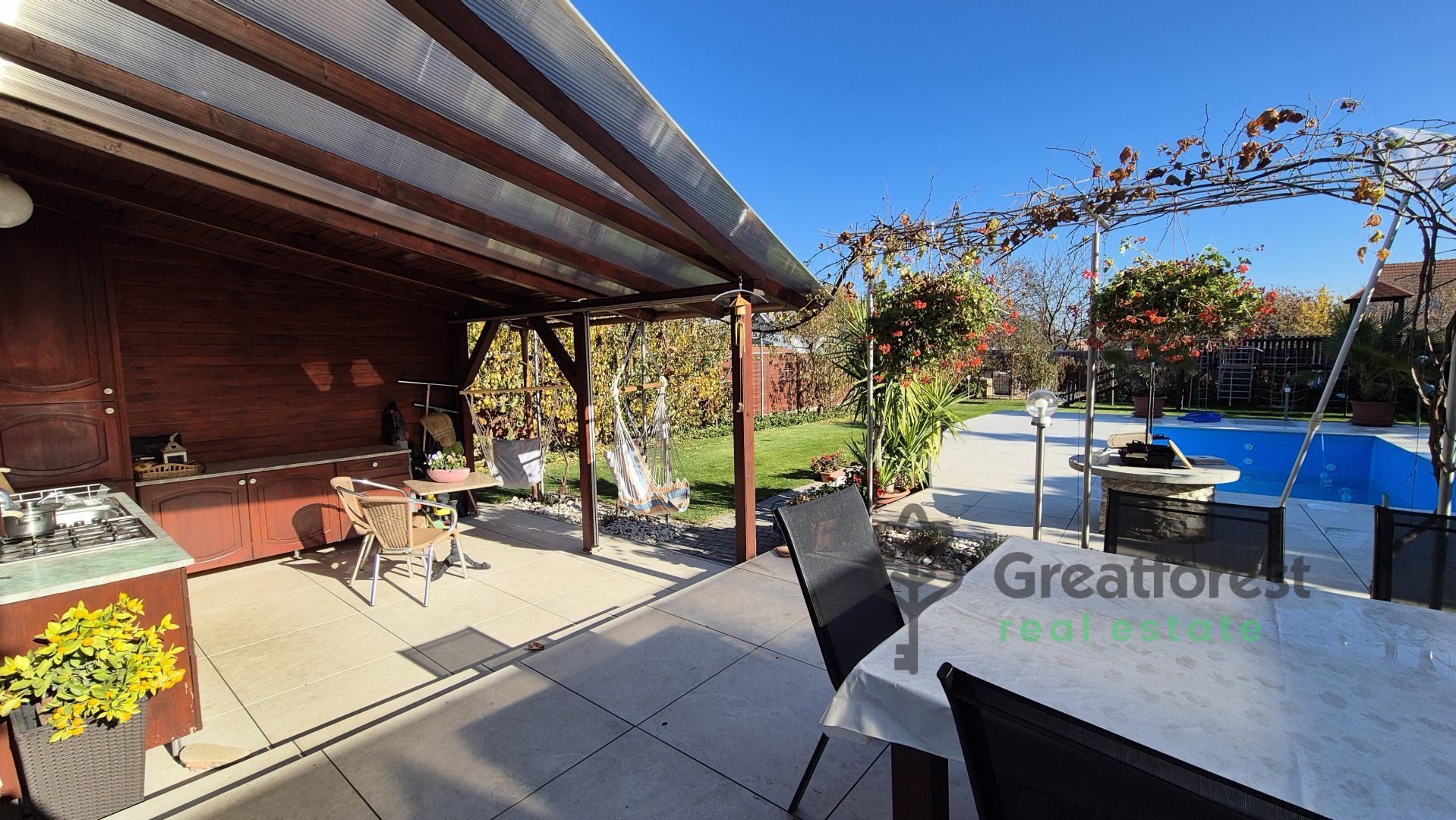 - can significantly reduce electricity costs. The walkways around the house are paved with paving stones, and the terrace and pool area have been completely renovated and repaved a year ago, awaiting their new owner.One of the highlights of the property is the spacious, approx. 75 m² terrace, which has a covered garden kitchen at one end and a covered relaxation area at the other