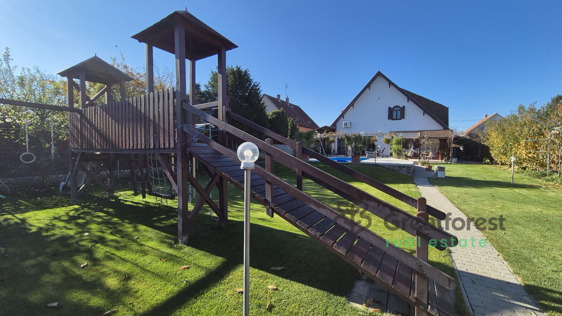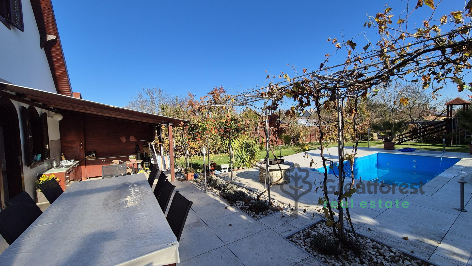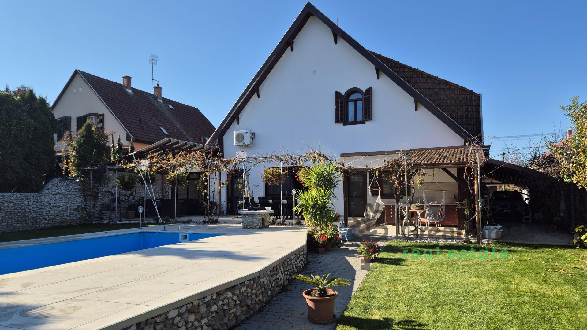 - meter heated outdoor pool, which can be used from the beginning of the season until late autumn, adding a touch of luxury to everyday life.The garden is a real, carefully designed green oasis: an automatic irrigation system, varied vegetation, fruit trees, hedges, a grape arbor running alongside the terrace, a separate kitchen garden and a compost bin complete the picture. A wooden playground offers a safe, private play area for children, while the pool and terrace provide a relaxation zone for adults. A tool shed takes care of everyday practicalities. The property also has a covered, enclosed parking space for two cars, making parking convenient and secure.With its spacious, bright rooms, well
