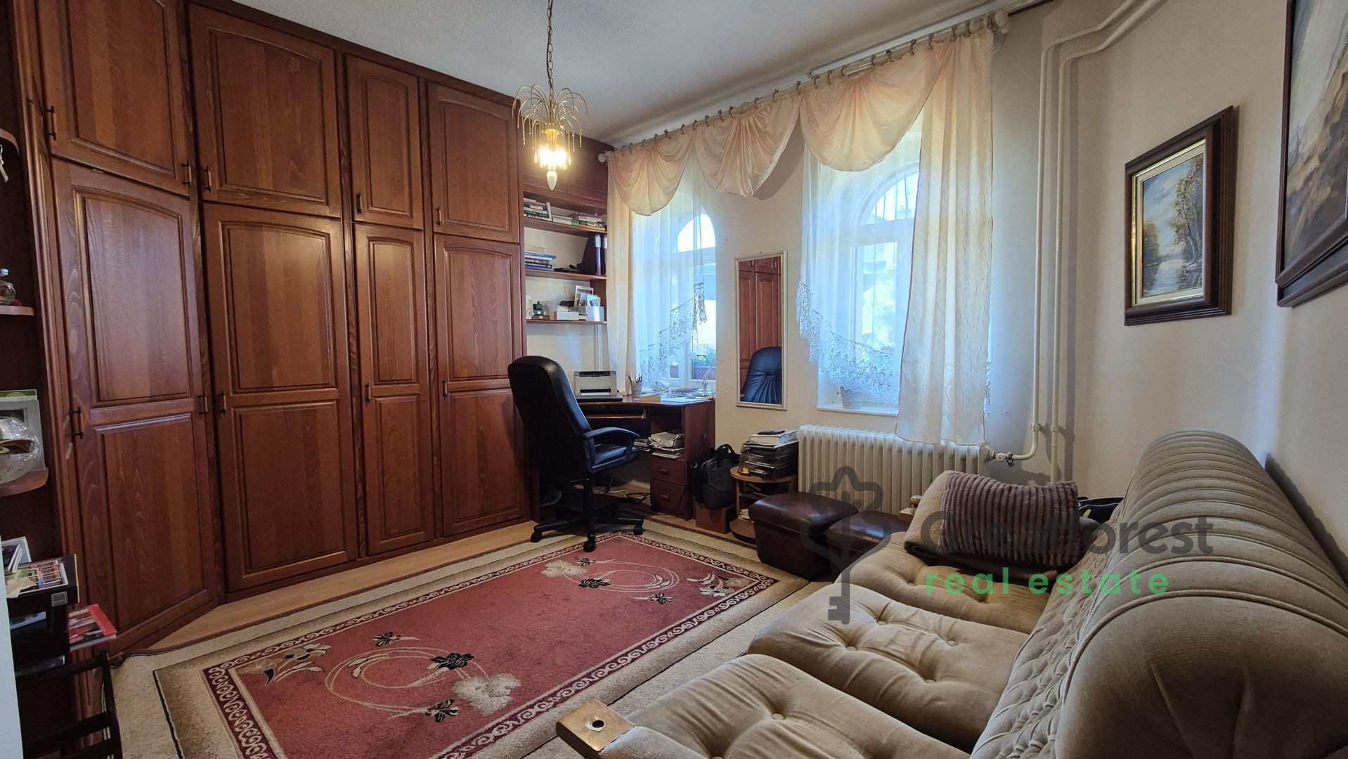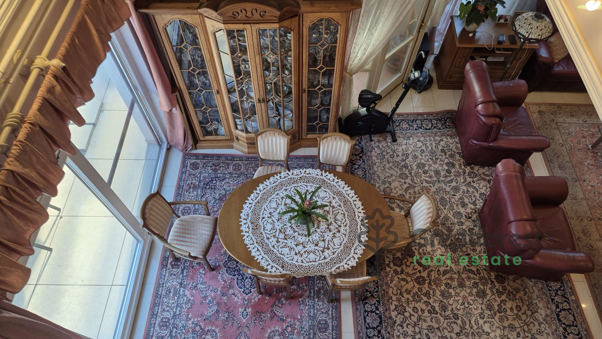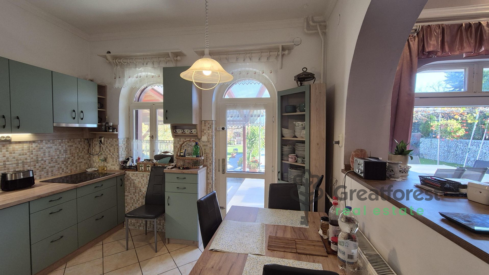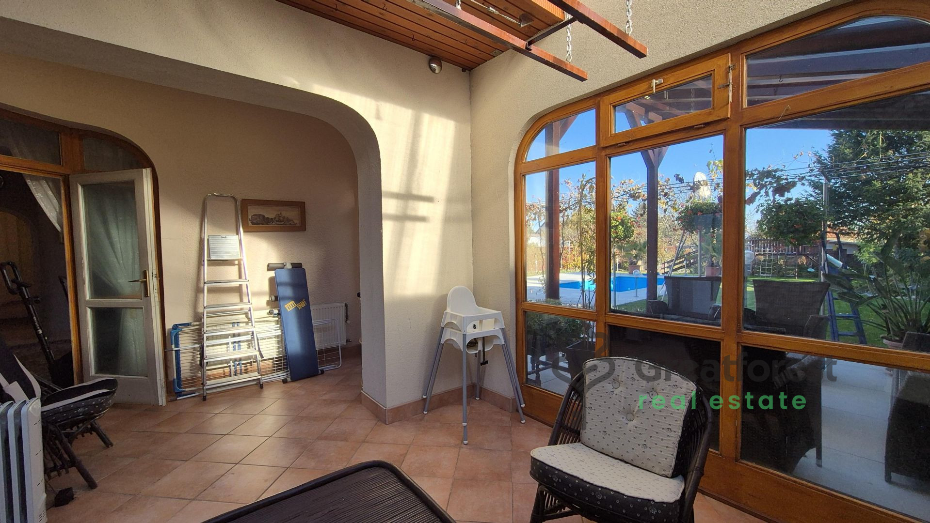 - meter heated outdoor pool, which can be used from the beginning of the season until late autumn, adding a touch of luxury to everyday life.The garden is a real, carefully designed green oasis: an automatic irrigation system, varied vegetation, fruit trees, hedges, a grape arbor running alongside the terrace, a separate kitchen garden and a compost bin complete the picture. A wooden playground offers a safe, private play area for children, while the pool and terrace provide a relaxation zone for adults. A tool shed takes care of everyday practicalities. The property also has a covered, enclosed parking space for two cars, making parking convenient and secure.With its spacious, bright rooms, well