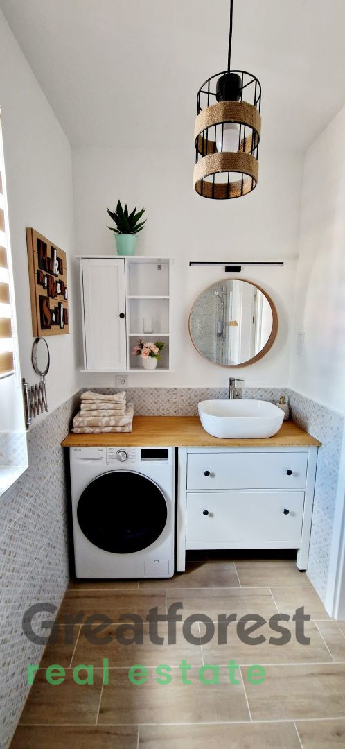 - out sofa. The bathroom has a washing machine and dryer, and the kitchen is fully equipped with a dishwasher, refrigerator, small kitchen appliances, tableware, and other kitchen utensils. Extras: