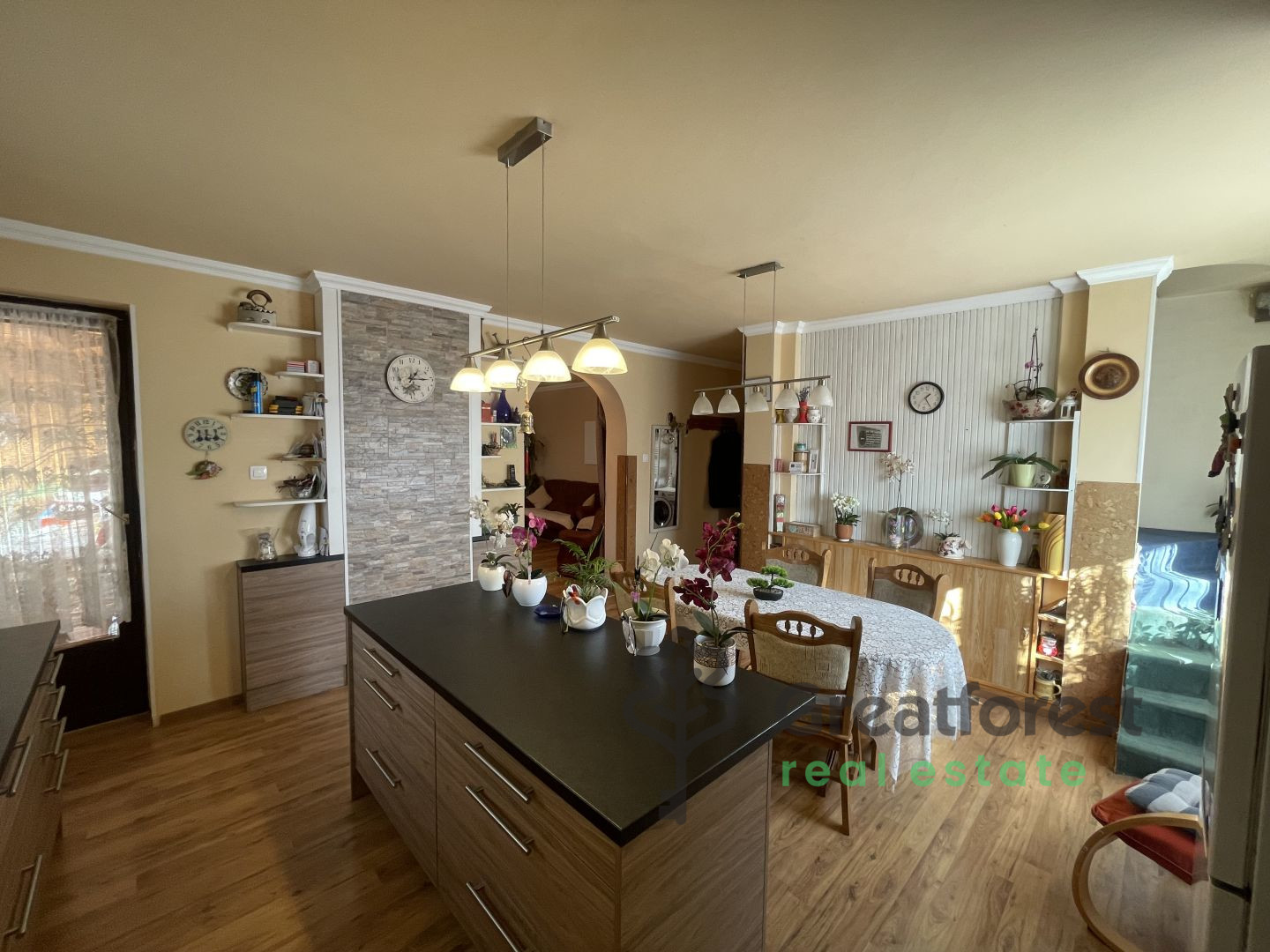 - plan kitchen and living room, 5 separate rooms and 2 bathrooms, making it ideal for larger families or multiple generations. The house has a covered terrace, a full basement and excellent storage space. Heating is provided by a solid fuel and electric system with a buffer tank and a 6.5 kWh solar panel system, thanks to which the utility costs are only approx. 10
