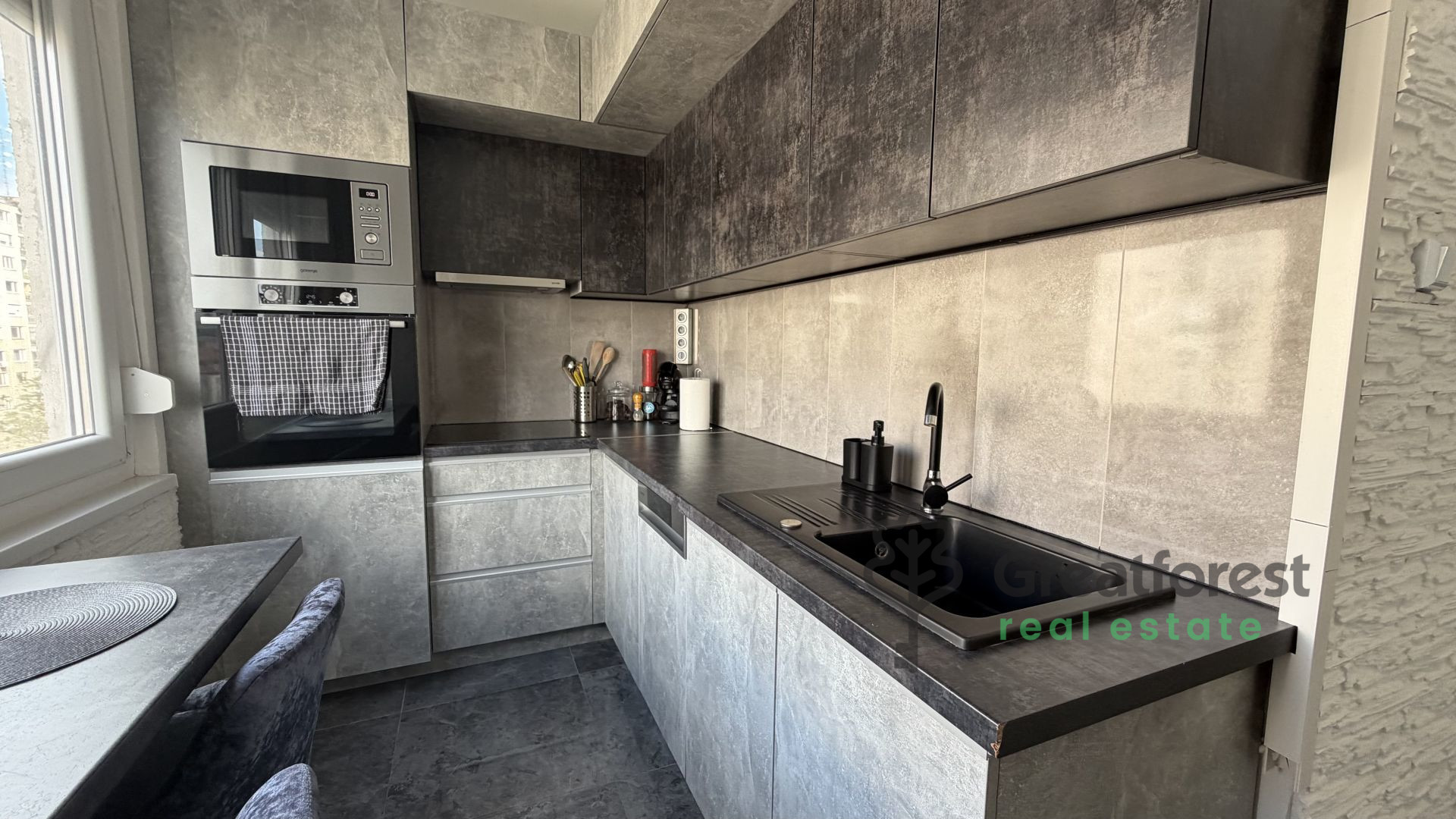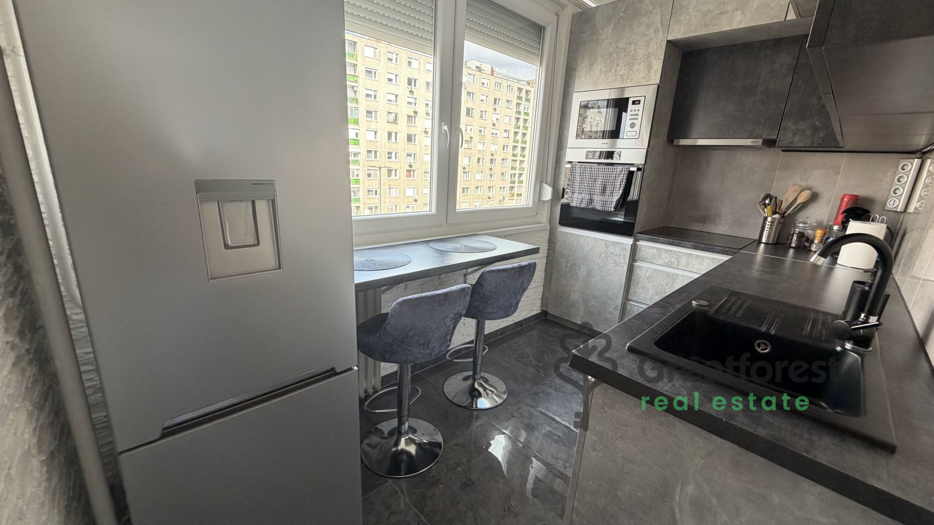 The kitchen has been completely renovated and is equipped with new, fully equipped kitchen cabinets. The apartment is extremely modern, tastefully designed, and sophisticated in every detail.